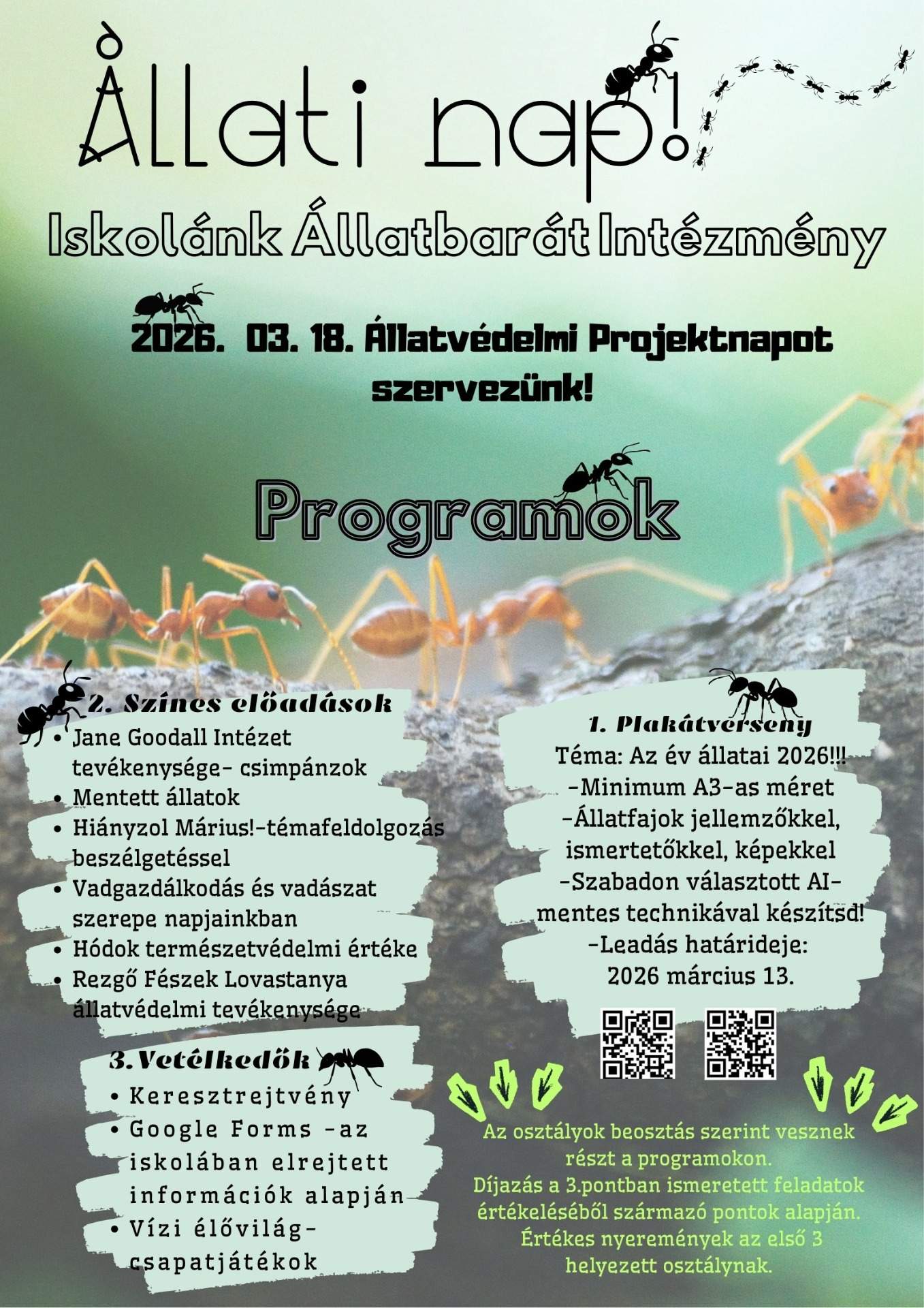 Állatvédelmi projektnapot hirdettünk az osztályainknak, amelyre az év állata témában plakátkészítéssel készülhetnek a jeles napra. A projektnap keretében pedig színes programokon és vetélkedőkön vehetnek részt. (ide fotózd be az elkészült program-plakátot…)
